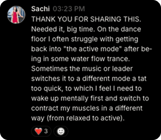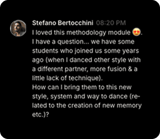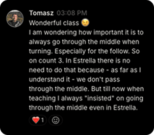 This isn’t a course. This is a high end community training. Build your profile, discover dancers near you, and chat in real time to organize practice sessions, weekends away, and festival trips. Your next partner—and your next crew—are one message away.